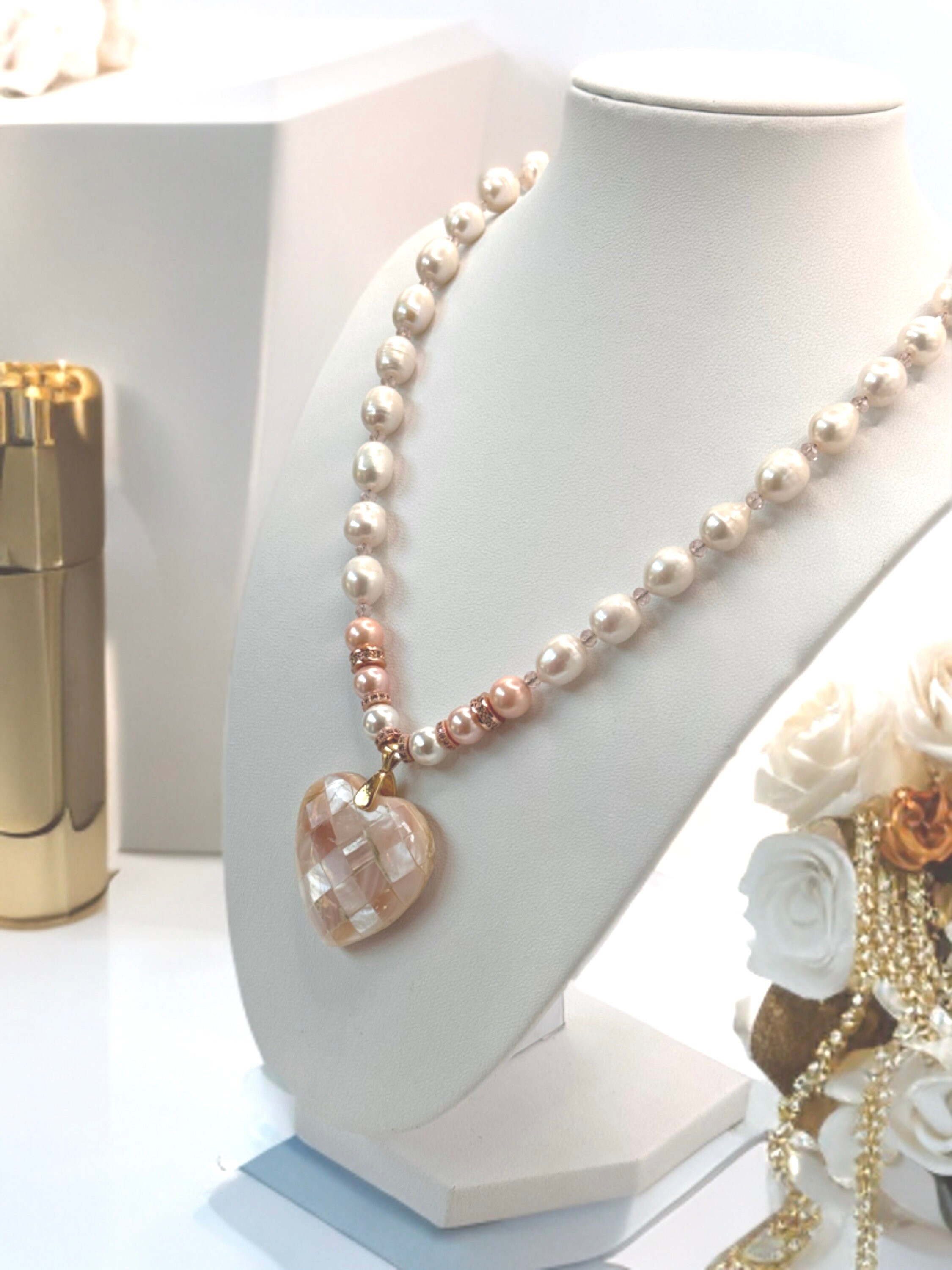 The necklace is quite elegant, with its large golden pearls leading to a captivating heart-shaped pendant crafted from a mosaic of warm-toned pieces, natural pink shell pendant. The heart pendant gives it a romantic touch, while the lustrous pearls add a sense of traditional luxury.